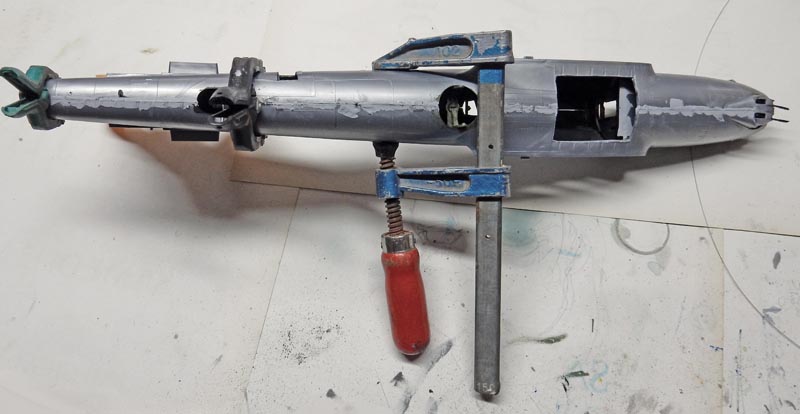 Collage des deux parties de la coque et masticage. Les grands moyens sont employés...