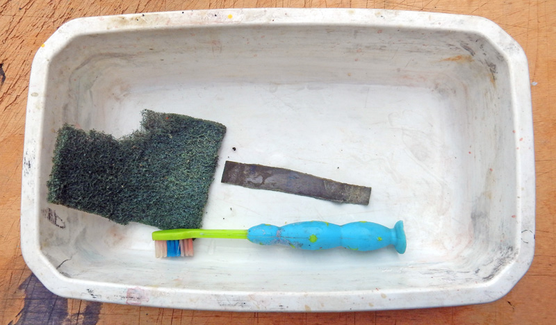 Le "kit" pour procéder avec la laque à cheveux. Une boîte avec de l'eau. Une vieille brosse à dents, du papier de verre 500, un bout de tampon Jex... Et... du doigté !
