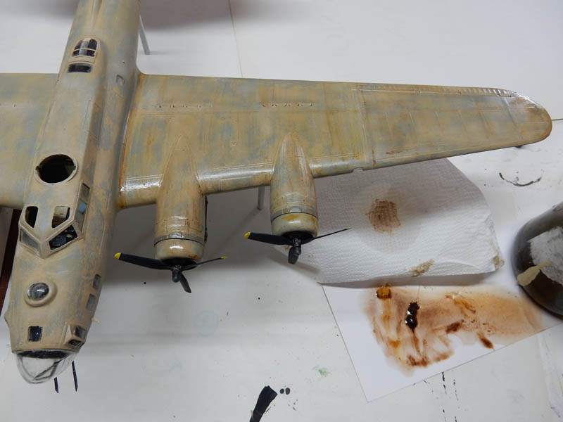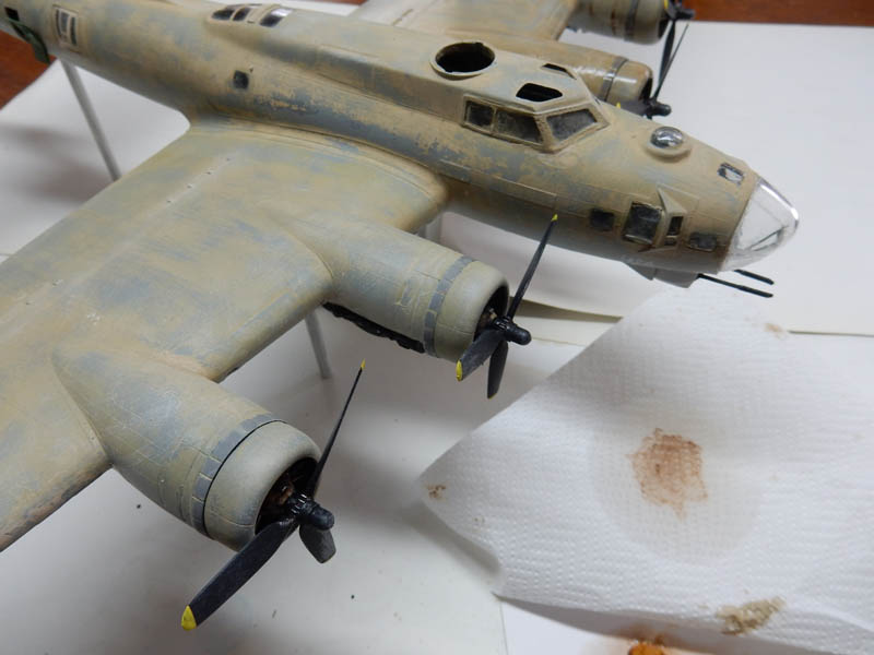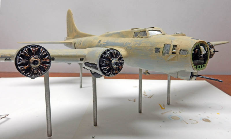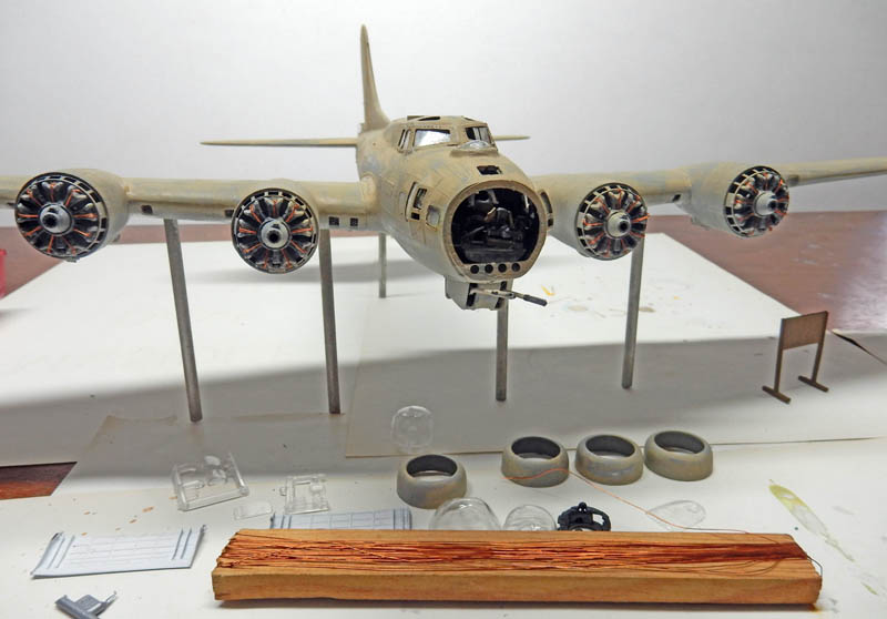 On fait une pose peinture pour fixer les moteurs Wright et coller deux fils par cylindre sur les 9 qu'en contiennent chacun des quatre moteurs. Et un ou deux câblages supplémentaire de ci, de là entre les cylindres car rien n'est fourni dans le kit Verlinden à leur sujet...