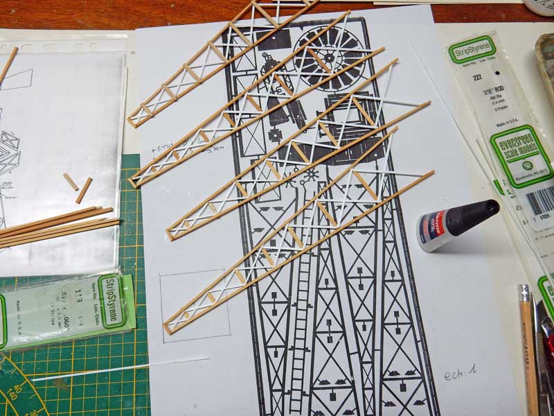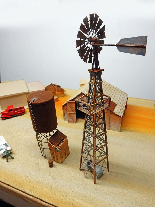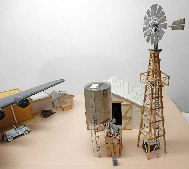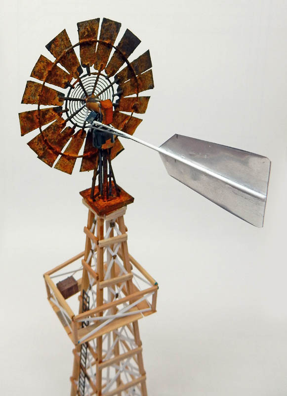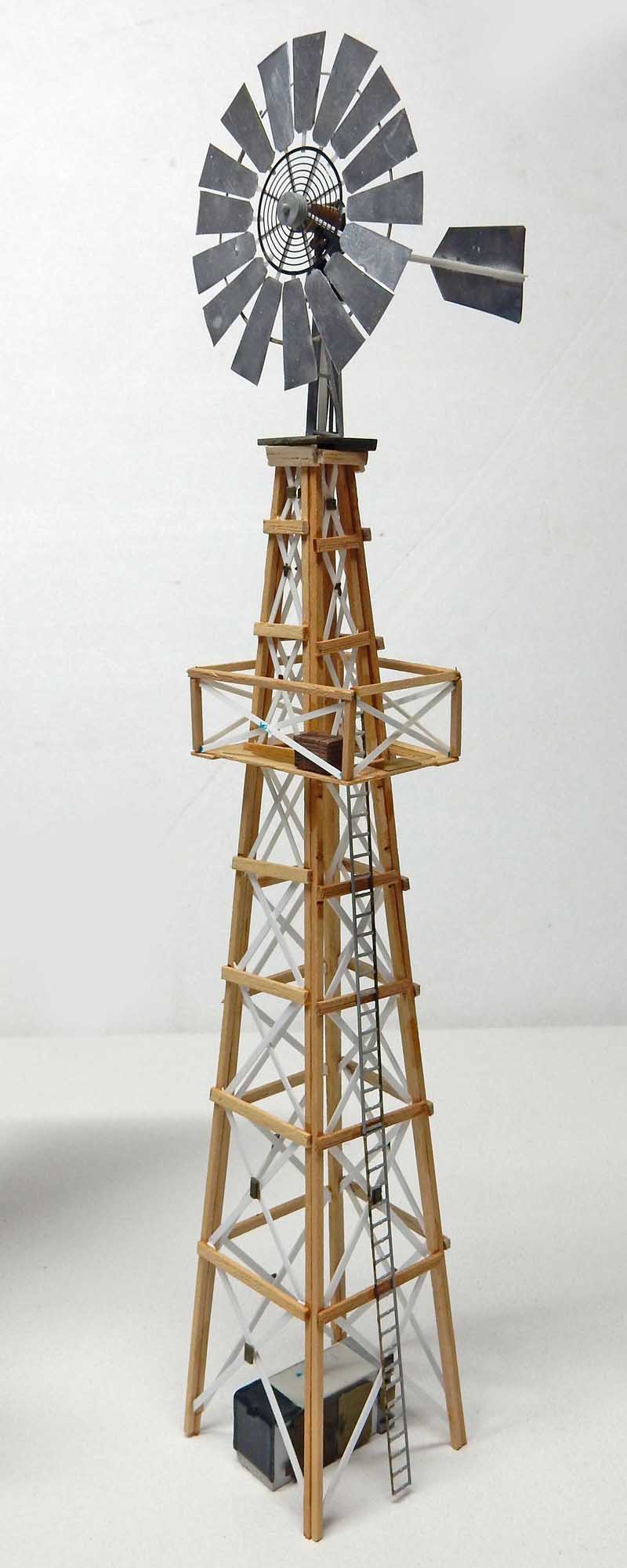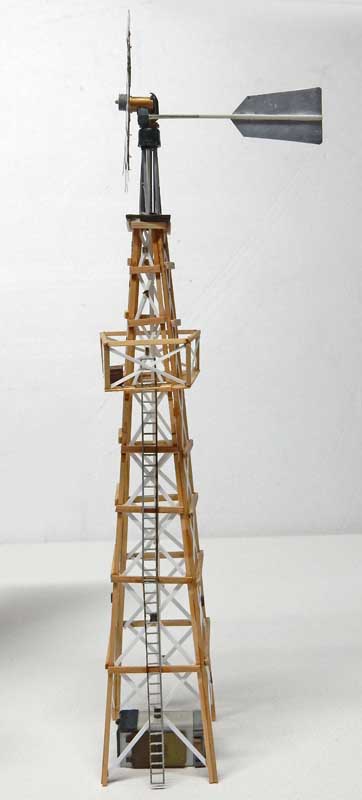 The wind turbine. Most of the construction is based on a photocopied plan, and is made of balsa wood and Evergreen plastic...