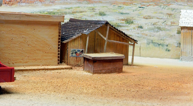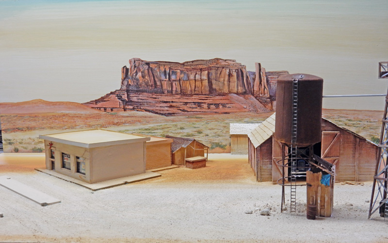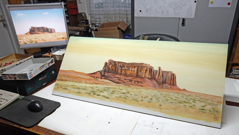 The background is created on a panel the width of the diorama, i.e. 1 metre - using brushes and airbrushes. Here, the dead horse mesa in Monument Valley...