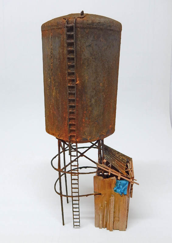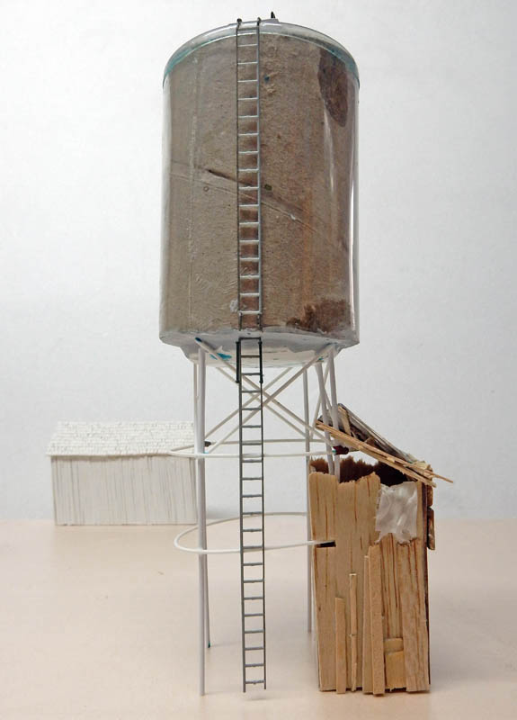 Un rouleau de carton pour le corps recouvert de feuille plastique souple. Pieds en tiges plastiques Evergreen. Cabanon de douche en balsa...