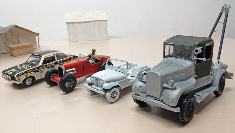 A variety of models will be displayed to enhance the overall effect. The Escort on the left, too English, was not chosen. The red car is a reworked "Tintin" vehicle, with airplane wheels. The tow truck was created from various parts...