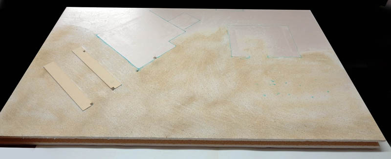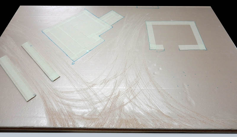 A second panel of roofmat (very dense polystyrene), 4.5cm thick, will serve as support. The locations of future buildings and markings are drawn and laid out...