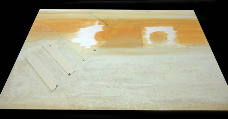 Back to the paintbrush, where a 70% diluted juice of burnt umber, yellow ochre and a little sienna are applied and wiped off more or less gradually...
