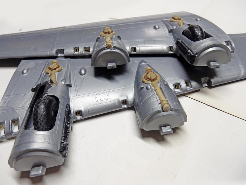 Pose des roues qui, sur ce type de bombardier ne sont qu'à demi rentrées. On installe également les prises d'air à l'avant des ailes. Les pièces, non fournies, sont découpées dans de la grille très fine de la boîte à surplus. On en profite pour ajouter des phares translucides dans chaque aile...