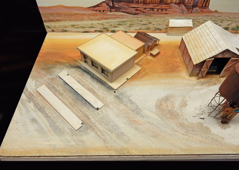 After applying wood glue to the surface, very fine sand is applied (note the small scale). Paint the foreground...