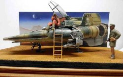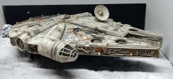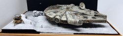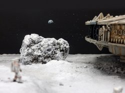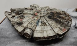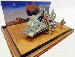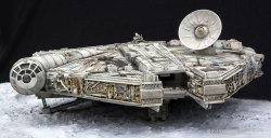 The "Millennium Falcon" from the trilogy. MPC model at around 1/87th scale. It has been completely redetailed. Note: it was on the moon in July 1969 ! Are we being lied to ? The astronauts are repainted "MICROMACHINES", not AIRFIX kit figures. The impacts on the spaceship are made with a pyrograver...