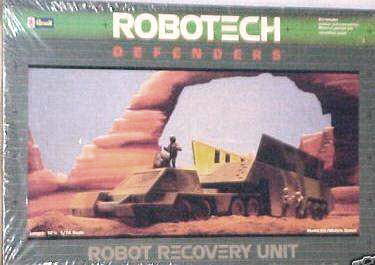 EVELL - série ROBOTECH - Robot Recovery Unit. Après avoir agrandi les pièces à la photocopieuse, je décidais de le construire à l'échelle 1/35ème. Le véhicule n'ayant quasiment pas de formes courbes, le montage fut aisé. Le tracteur et la remorque seront assemblés avec du carton à dessin. Les détails viennent de pièces de camions 923 ITALERI. Les figurines viennent de la marque DRAGON. L'engin volant dans son logement est fait à partir de pièces de la boîte à surplus (éléments de Star Trek, cellule de Cobra)...