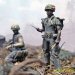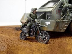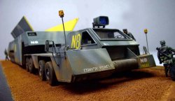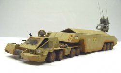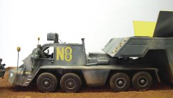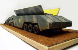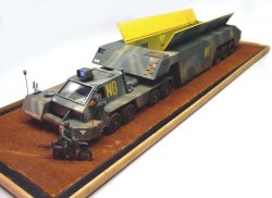 The idea for the lab-futuristic truck came from a commercially available 1/72 scale model of the R1EVELL - ROBOTECH - Robot Recovery Unit series. After enlarging the parts on a photocopier, I decided to build it in 1/35th scale. As the vehicle has virtually no curves, assembly was easy. The tractor and trailer were assembled from drawing board. Details come from ITALERI 923 truck parts. The figures are from DRAGON. The flying machine in its housing is made from surplus box parts (Star Trek elements, Cobra airframe)...