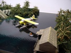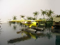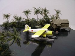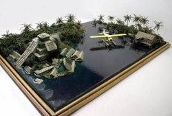 Ce diorama est inspiré d'une publicité dans les magazines sur les briquets Camel Trophy. La scène comprend quarante cinq cocotiers fabriqués à partir de mimosa et de racines d'arbres. Le temple maya est une fabrication de LapinBaulGarou, en fait un raté au démoulage. L'avion est le Nordhuyn Norsman de la marque MATCHBOX à l'échelle 1/72ème entièrement redétaillé. La cabane est le Jungle Poste d'AIRFIX. De la résine est disposée en plusieurs couches fines après peinture du fond à l'aérographe et coloration des deux premières couches...