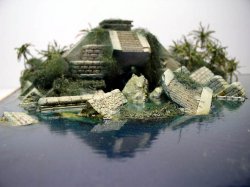 This diorama was inspired by a magazine advertisement for Camel Trophy lighters. The scene includes forty-five coconut palms made from mimosa and tree roots. The Mayan temple is made by LapinBaulGarou, and is in fact a mould release dud. The airplane is the MATCHBOX Nordhuyn Norsman in 1/72nd scale, completely redetailed. The cabin is the AIRFIX Jungle Poste. Resin is applied in several thin layers, after airbrushing the background and coloring the first two layers...
