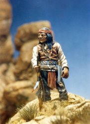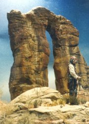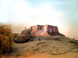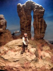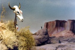Un hommage à Gir et Blueberry. L'idée de départ est l'arche en pierre de l'album "Chihuahua Pearl". Blueberry et sa monture ont été remplacés par un apache SERIE 77 en plomb 90mm qui fait le guet. Le décor est sculpté en plâtre à modeler sur armature. Le cheval est une figurine TAMIYA à l'échelle 1/35ème. Le crâne est sculpté en mastic à deux composants. Des figurines PREISER à l'échelle 1/225ème sont disposées à l'horizon. Une peinture en trompe-l'oeil sur le fond complète la scène... Le diorama est réalisé en "perspective forcée" - l'échelle diminue à mesure que l'on s'éloigne vers l'horizon...