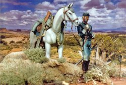 Major Dundee. Figurine plomb AMATI 90mm. Le cheval vient de la marque VERLINDEN, l'équipement est fabriqué à base  de mastic à deux composants. Le rocher est sculpté avec du plâtre à modeler...