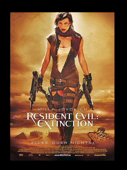 Resident Evil Extinction. Film de série B - adapté du jeu video du même nom - (pourtant avec de gros moyens), séquelle du premier film et dont les suivants ne relèveront pas le niveau, bien au contraire... (Mais que peut-on attendre en créant un film à partir d'un jeu video dont le but est de tuer un zombie toutes les deux minutes ?!!!)