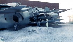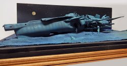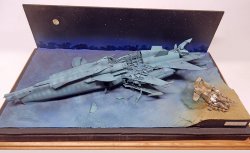 Another two-level diorama: in the foreground, a WARHAMMER shuttle in 25mm scale, and the ship in the distance in mist in 1/87th scale. The aircraft is made entirely from salvaged parts, a fine example of the art of accommodating leftovers...