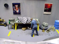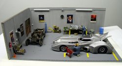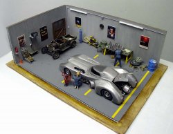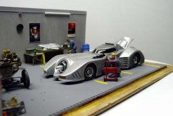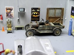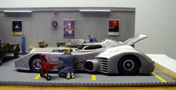 La Batmobile d'AOSHIMA à l'échelle 1/32ème. Pour la présenter autrement que noire, sa couleur de base, il n'y avait qu'une solution: la montrer en construction dans un garage d'Hollywood. Le capot moteur est découpé pour y loger une turbine et la base du chassis revue. Les grilles d'échappement sont également refaites ainsi que le tableau de bord.