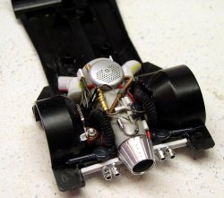 The AOSHIMA Batmobile in 1/32 scale. There was only one way to present the Batmobile other than in its basic black color: to show it under construction in a Hollywood garage. The hood was cut to accommodate a turbine, and the frame base was redesigned. The exhaust grilles were also redone, as was the dashboard.