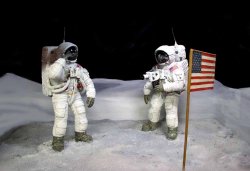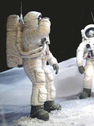 Surely the greatest human adventure... 120mm figures from REHEAT MODELS. The survival bags have been improved, as have air hoses. The camera is scratchbuilt. The hardest part was rendering the effect of the thick white fabric and the inverted reflection of the visors...